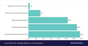 Damit wird der Pfad kürzer – und die Entscheidung, ob überhaupt noch geklickt wird, fällt häufiger direkt auf Google. Das Diagramm macht zudem deutlich, wie AI‑Overviews das Nutzerverhalten verschieben. Nur 1 % klicken auf einen Link im KI‑Summary und 8 % wählen überhaupt noch ein Ergebnis an . Die Mehrheit beendet die Suche, wechselt zu einer anderen Website oder sucht einfach auf Google weiter – ein klares Signal für die Zero‑Click‑Tendenz.