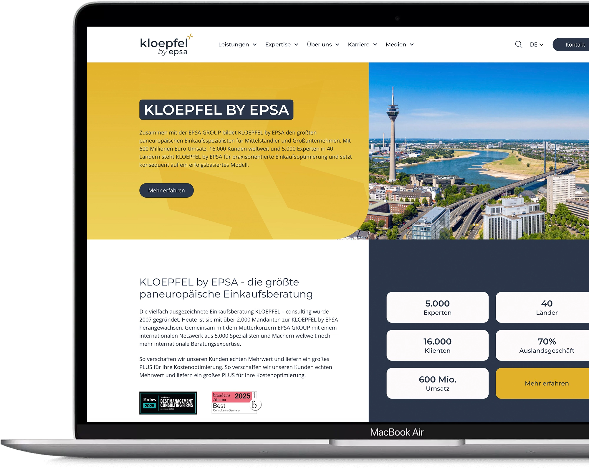 KLOEPFEL by EPSA steht mit 600 Mio. € Umsatz, 16.000 Kunden weltweit und 5.000 Experten in 40 Ländern für praxisorientierte Einkaufsoptimierung und das 100% auf Erfolgsbasis.